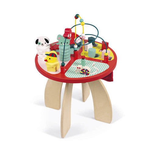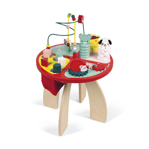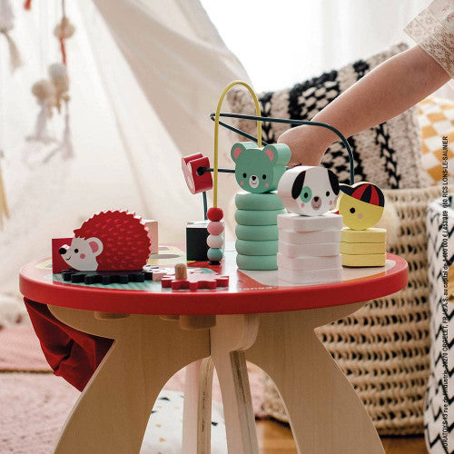 Here's a must-have baby toy! A wooden activity table with lots of manipulative and embedding games for children from 1 year old! This beautiful and colourful multi-activity table is a wonderful playground for babies. So let's get started! Let baby discover and have fun in complete autonomy with these 4 playgrounds! It's fun to play with everything! There are lots of funny things to do: 3 stacking animals and a labyrinth to develop dexterity, a 4-wheel gear system for coordination, 5 cubes to fit in to learn shapes and colours, and an abacus to develop concentration and motor skills. All of this in a joyful and funny universe populated by ducks with caps and multicoloured snails, yippee! As for the decoration, we love the 4 legs that have kept their natural wood tone! The table is 37 cm height (14.6")