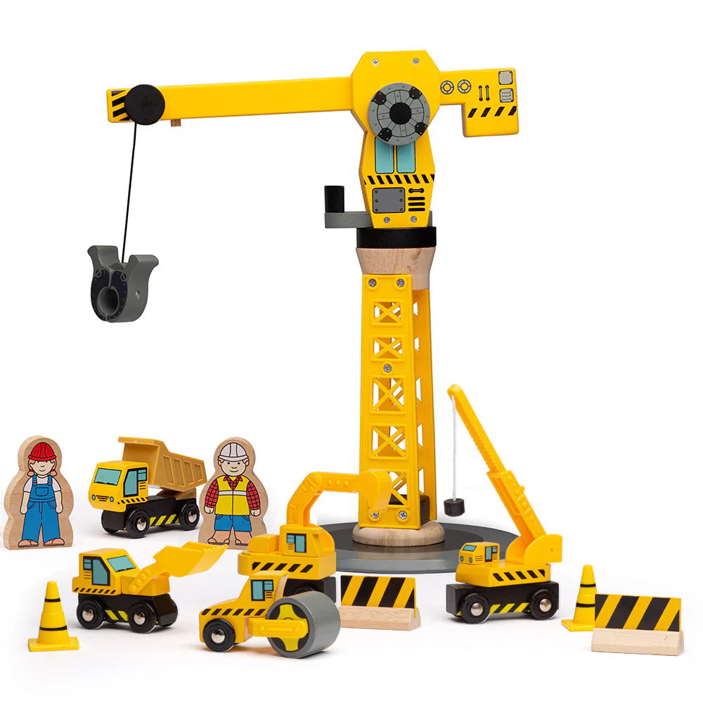 It’s tiring work at the building site and time to get serious! Towering up into the skyline, this working wooden crane toy can lift a load, swivel it around and also move it forwards and backwards. An impressive wooden train accessory, it’s just like the real thing!