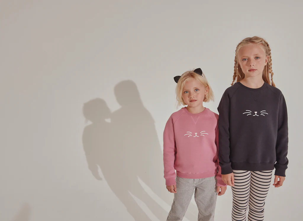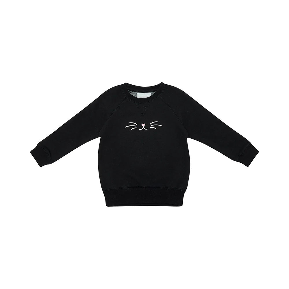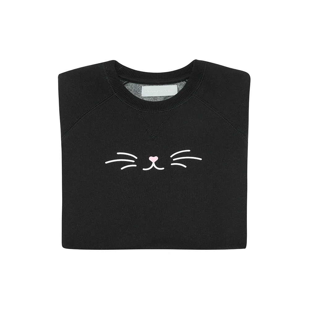 A relaxed / baggy style Black sweatshirt with a white + pink cat face print - designed to be a loose fit, size down for a less over sized look.