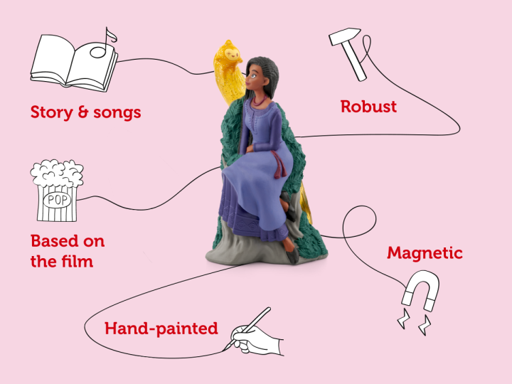 Join a courageous young dreamer called Asha and Star, a glowing ball of boundless energy, on a magical adventure to save her kingdom's wishes. All your little wish-makers have to do is pop this Tonie on their Toniebox and they’ll be right there as Asha, Star and Asha’s pet goat Valentino confront a most formidable foe – the ruler of Rosas, King Magnificon. This short story version of Disney’s Wish proves that wondrous things can happen when you believe and have courage.
