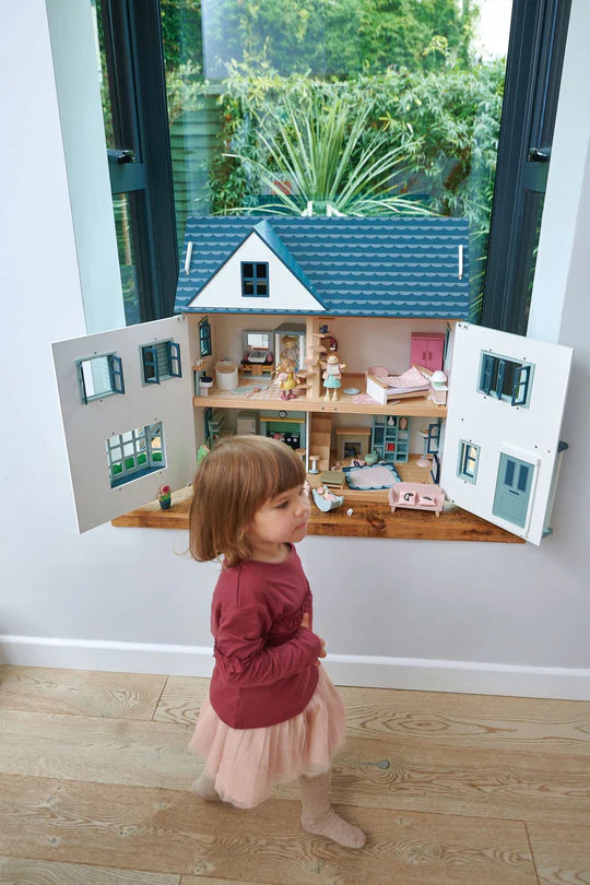 Dovetail wooden dolls house – the house of your dreams! This impressive, double fronted and stylish house is ready to move into! The Dovetail is the smartest house on the street – a two storey home with room in the room for all sorts of play. There are window boxes full of plants, shutters on the windows, a porch and on the front door there is even a seasonal wreath to welcome in all your friends. On the front, a dove has come to visit, and his friend the fox is nearby, waiting to greet the family when they come home. The house opens up at the middle to show all three floors, with a stylish open staircase to move between the floors. Using top quality birch plywood to construct the house and furniture made from sustainable rubber wood which never chips, this is a toy that will really last. The house is supplied empty so you can either fill it with your own possessions, or really go to town and invest in the designer furniture that can be purchased with it. There is a kitchen set, a sitting room set, a bathroom set, a bedroom set, a kids room set and with the growing family, a nursery set. This is a spacious home for a family who are going places – we love the detail in the house design and the room sets are absolutely charming! Collect them all to make a truly memorable toy world that will be remembered by children for ever! Self assembly required.