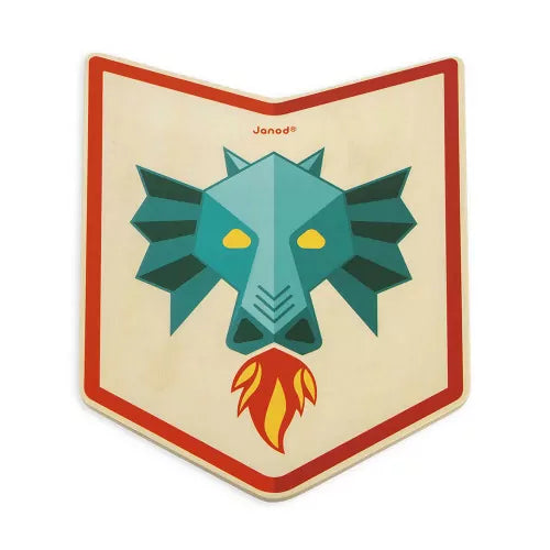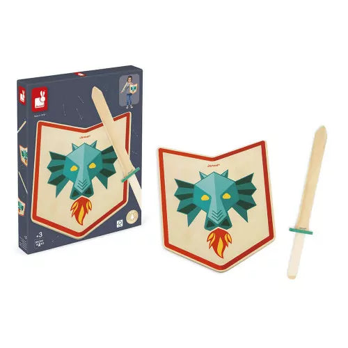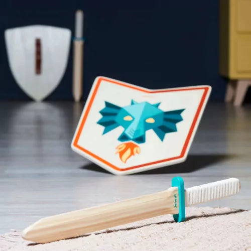 Hear ye, hear ye, brave knights! Defend the fortified castle from enemy attack! You are part of the army of fire-breathing dragons! Enough to impress your opponent in the sword fight that awaits you! Grab your magnificent wooden shield with one hand, using the leather handle on the back, and your trusty sword with the other. The handle is covered with fabric for better support. The beautiful shield, decorated with a dragon's head and enhanced by a red frame, has a very original shape. From 3 years old, develop children's imagination, communication and motor skills with this perfect set to complete knight costumes. This set includes 1 sturdy wooden shield and 1 matching wooden sword. The shield measures 31cm x 40cm. Also available in wolf version. Wooden toy from sustainably managed, FSC®-certified forests.