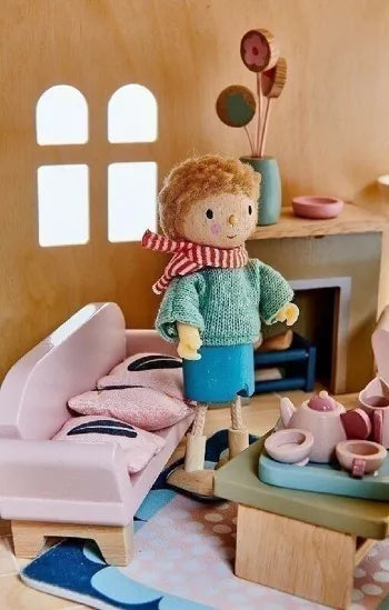Edward is a gorgeous solid wood boy doll scaled for our dolls houses. He wears a cosy striped jumper and he's just off out to play on his skateboard!