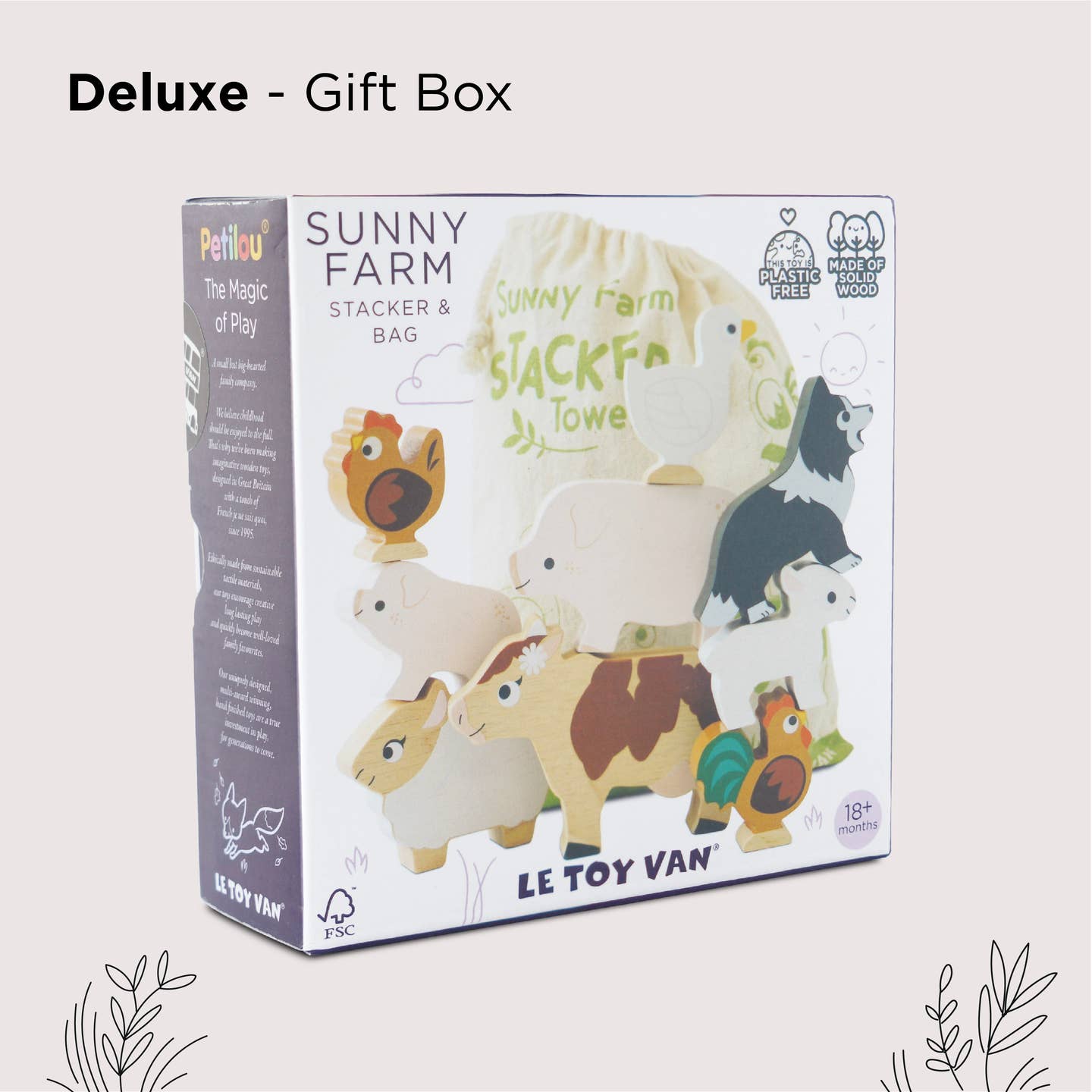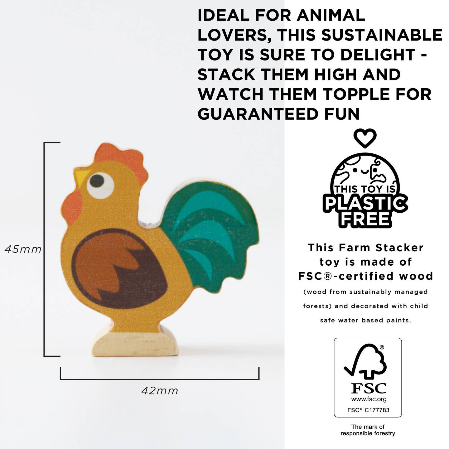 Farmyard fun awaits with this wonderful animal stacking toy, the perfect educational gift for young learners. Comprising nine beautifully crafted animal pieces made from durable FSC® - certified wood, this eco-friendly toy is sure to become a playtime favourite. Each stackable character features a lovely painted design, using water based, child-safe colours and includes all their farmyard favourites, pig, piglet, cow, hen, chicken, sheep, lamb, dog, and a duck. There’s even a handy cotton drawstring bag to keep them safe when not in use. A great toy for developing open ended play.