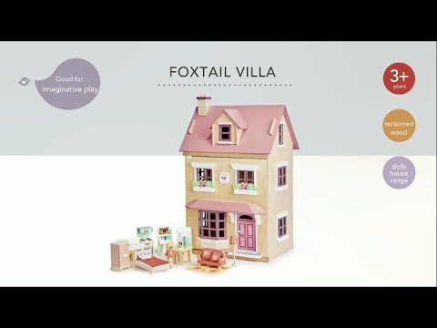 Foxtail Villa is the perfect town style dolls house. The subtle colours and top quality FSC plywood fascia make this a beautiful mid size dolls house for any little boy or girl. with a clever design to lift and hold the roof to access the attic. Included is a starter set of matching furniture: A cooker, sink unit, table and chair, bowl of apples, sofa with printed cushions, standard lamp, bed with coverlet, wardrobe, retro style toilet and bathroom sink unit. Self assembly required.