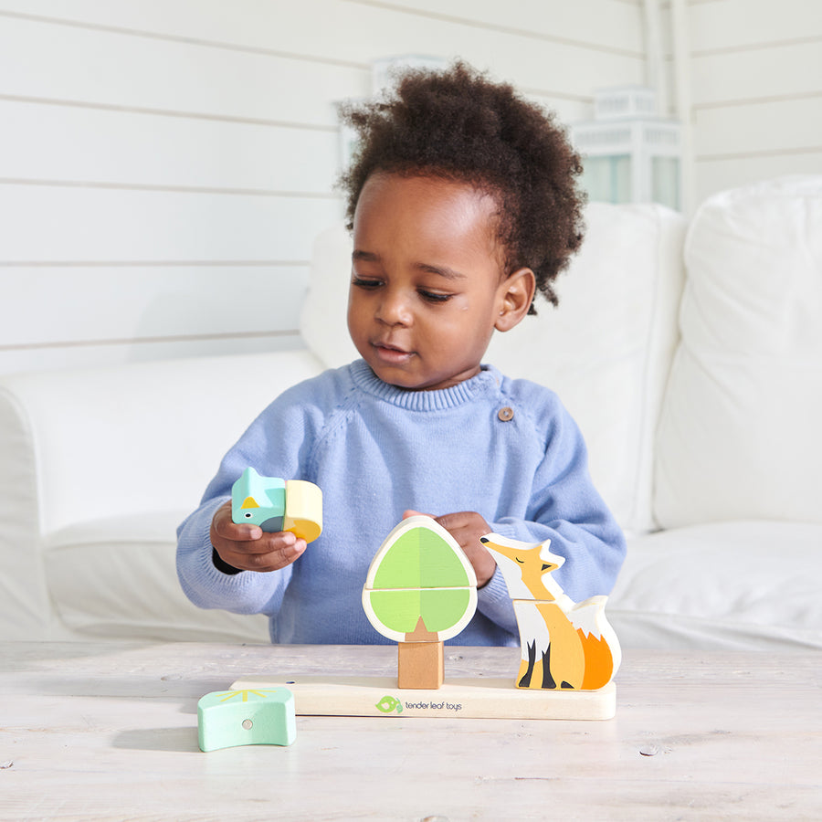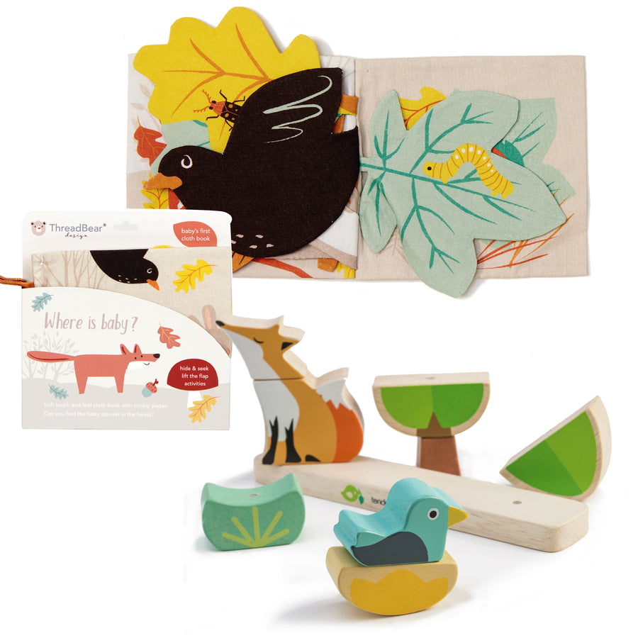 A fabulous gift set which includes our wooden Foxy Magnetic Stacker toy and Where's Baby activity cloth book! The Soft activity book is perfect for babies with crinkly sounding pages. Each page is the shape of an animal or leaf and is turned to reveal the next woodland animal.