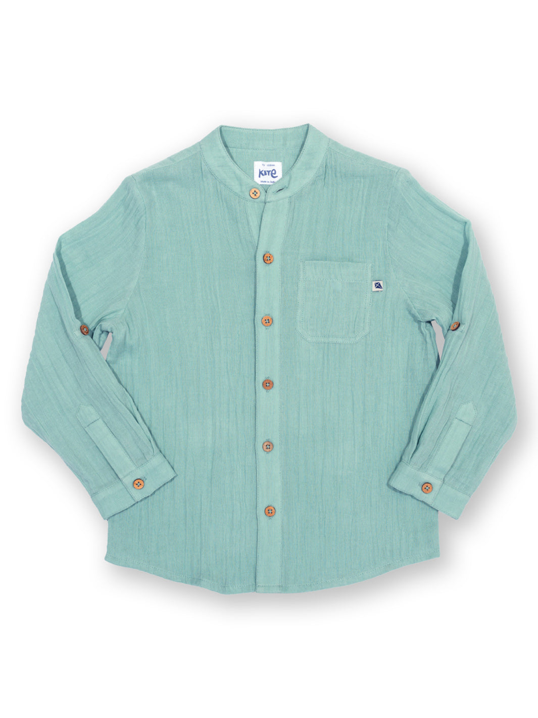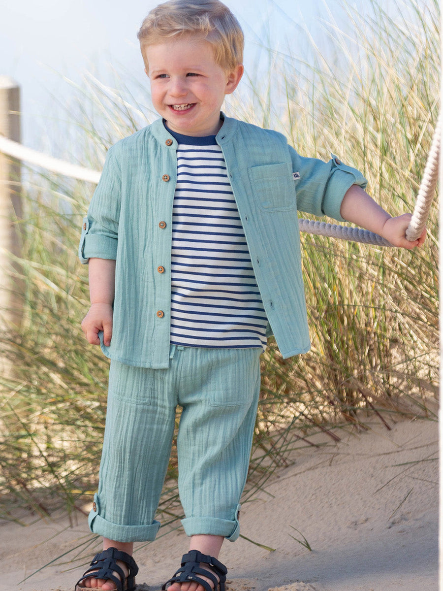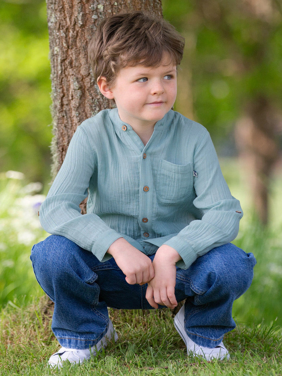 Twice the style, all the comfort! Our aloe muslin shirt is a wardrobe winner, offering versatility with its classic grandad collar and coconut buttons. Roll up the sleeves to 3/4 length or wear them full-length to suit the day. Pair it with our muslin pull-ups for a coordinated outfit, or layer it over a t-shirt with comfy jeans for a trendy, laid-back look. Made from 100% organic cotton.