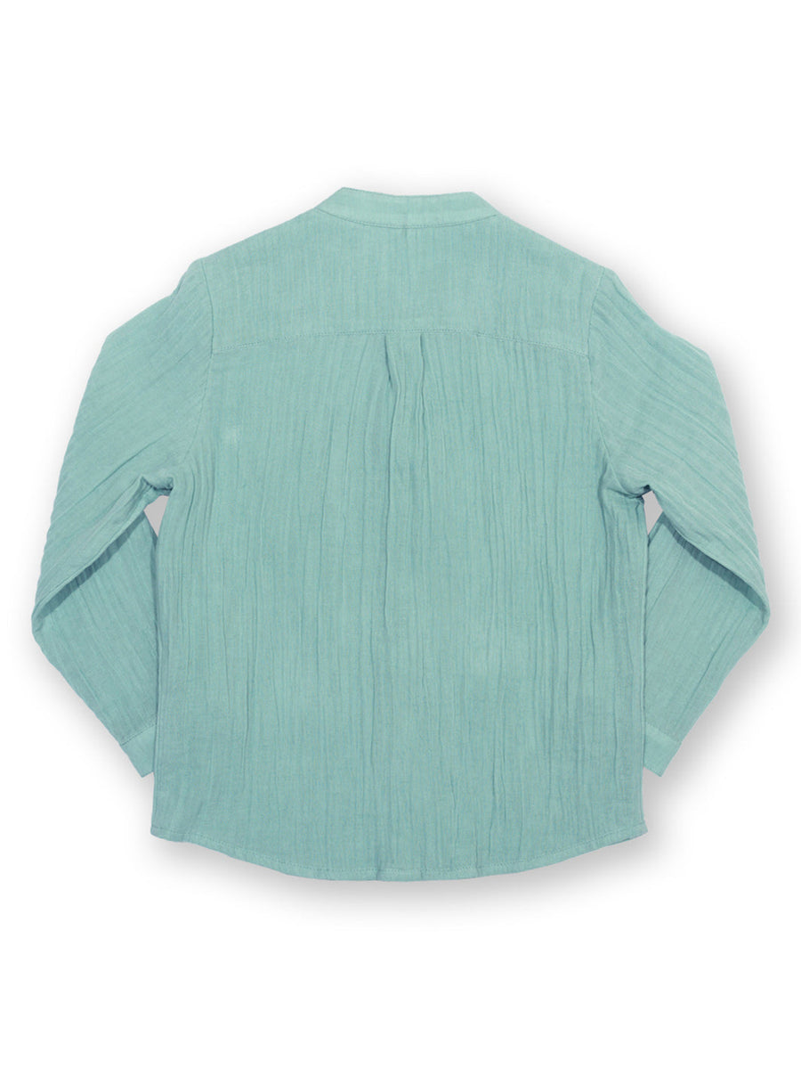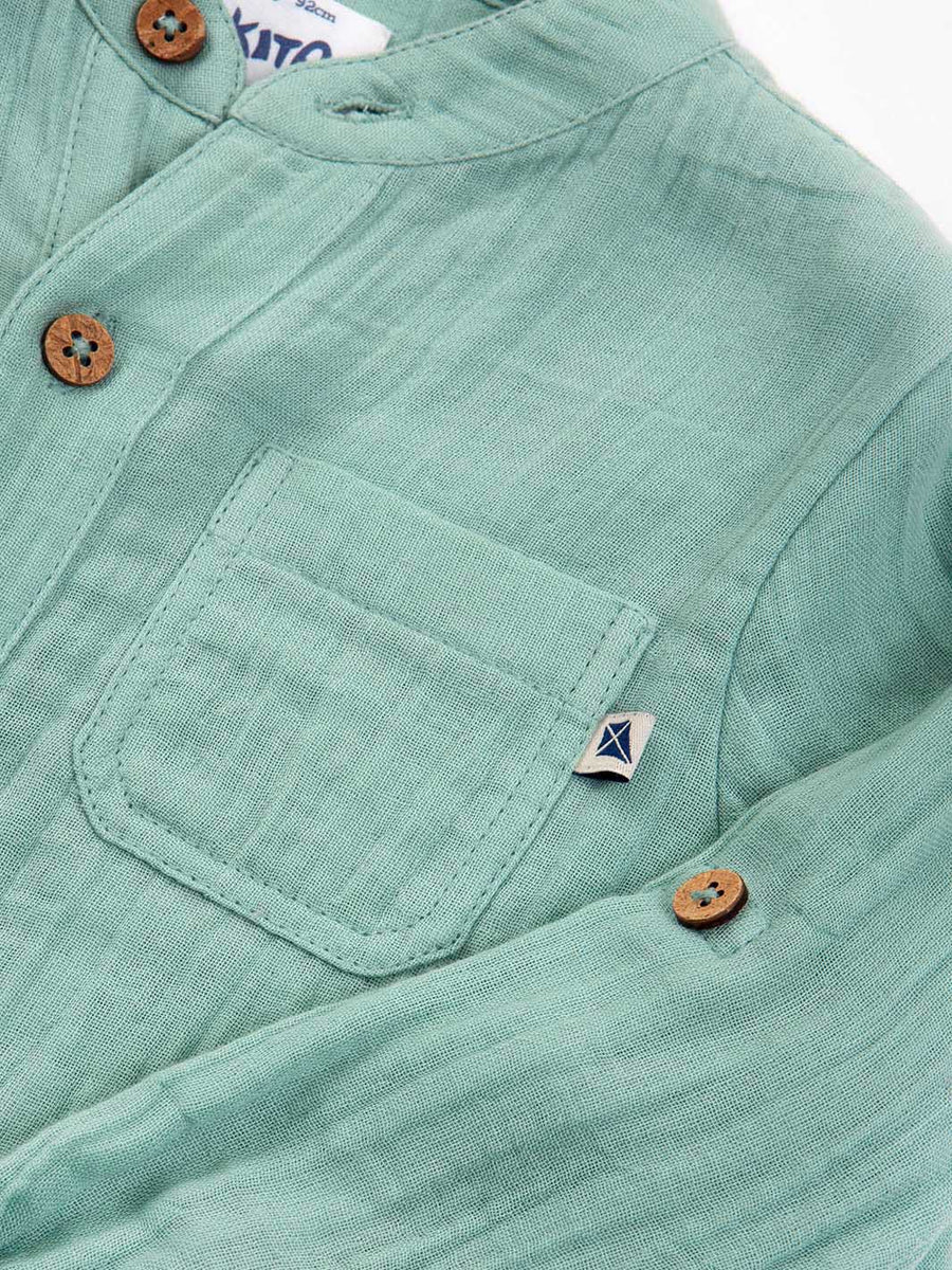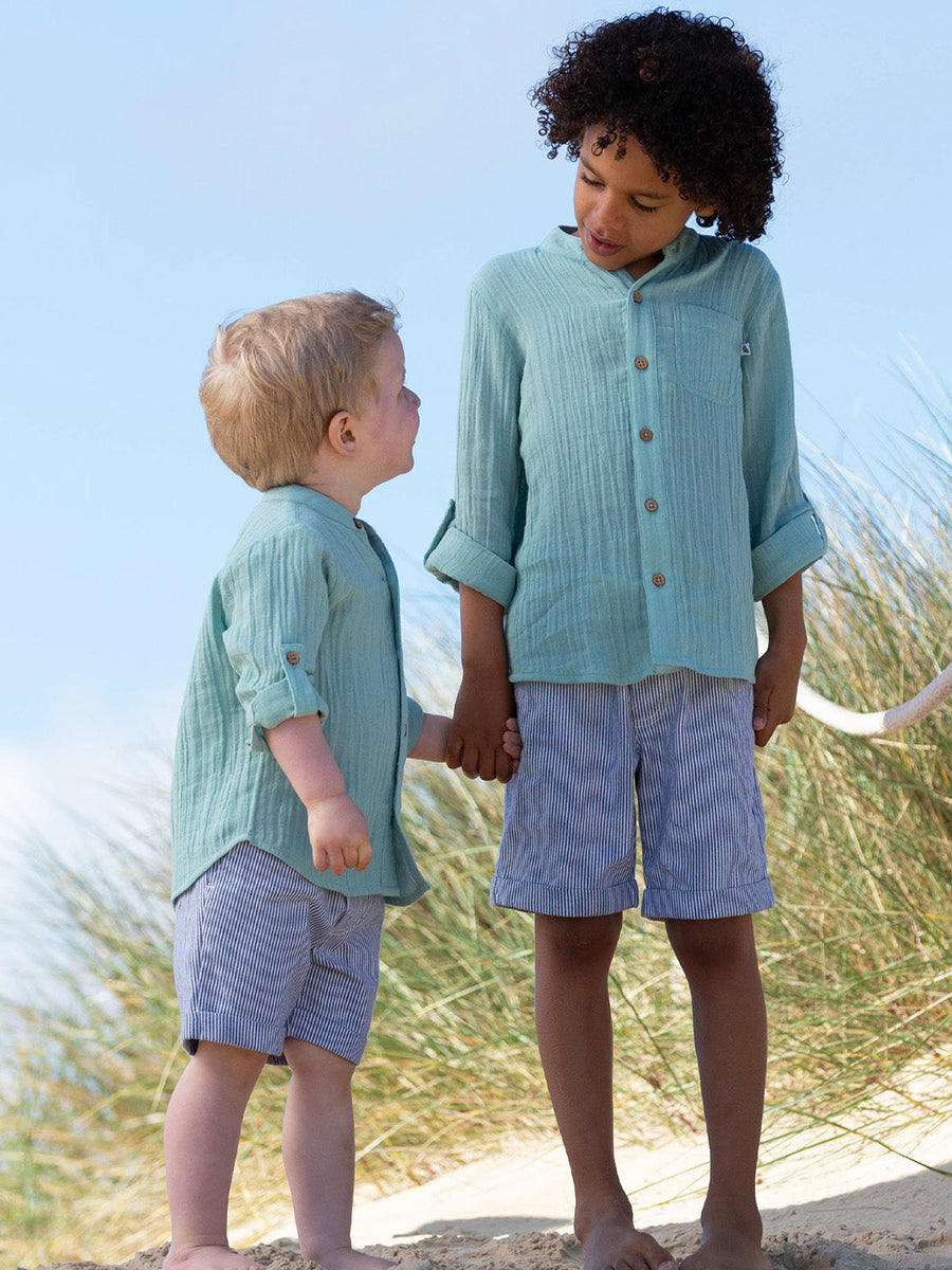Twice the style, all the comfort! Our aloe muslin shirt is a wardrobe winner, offering versatility with its classic grandad collar and coconut buttons. Roll up the sleeves to 3/4 length or wear them full-length to suit the day. Pair it with our muslin pull-ups for a coordinated outfit, or layer it over a t-shirt with comfy jeans for a trendy, laid-back look. Made from 100% organic cotton.