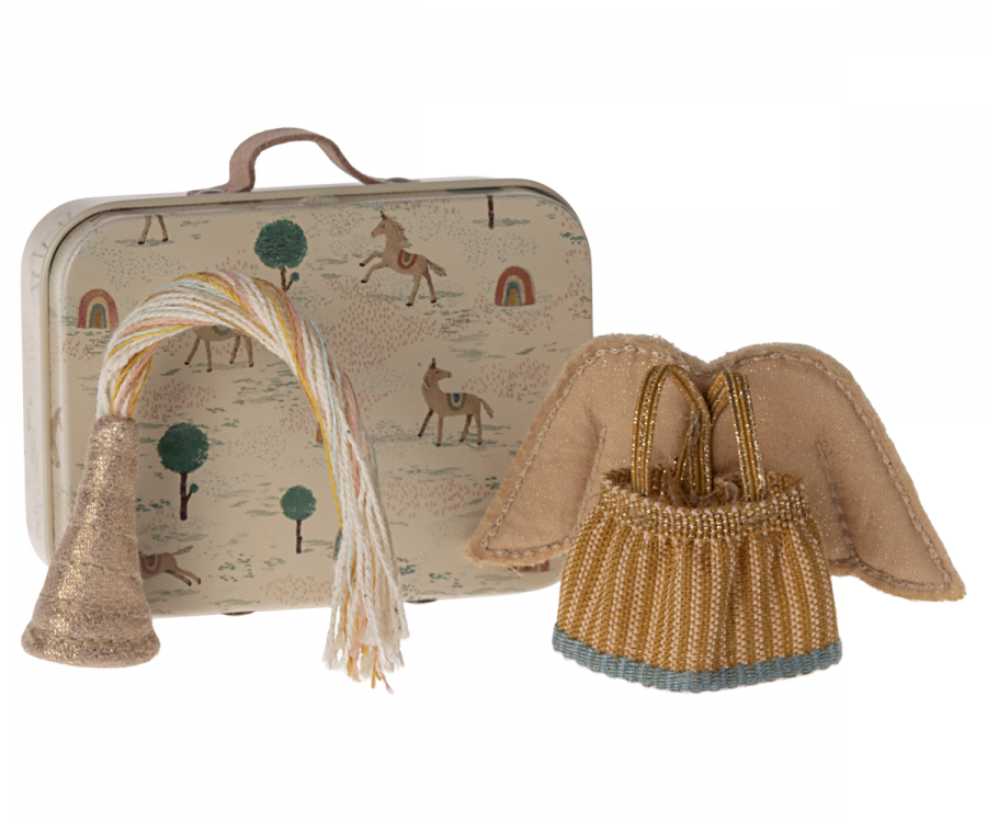 Transform your Little Sister Mouse into a magical fairy with this enchanting outfit! This beautifully crafted set includes a delicate tutu, fairy wings, and a sparkling headband, all tucked away in a charming Maileg suitcase. Perfect for storytelling and imaginative play!