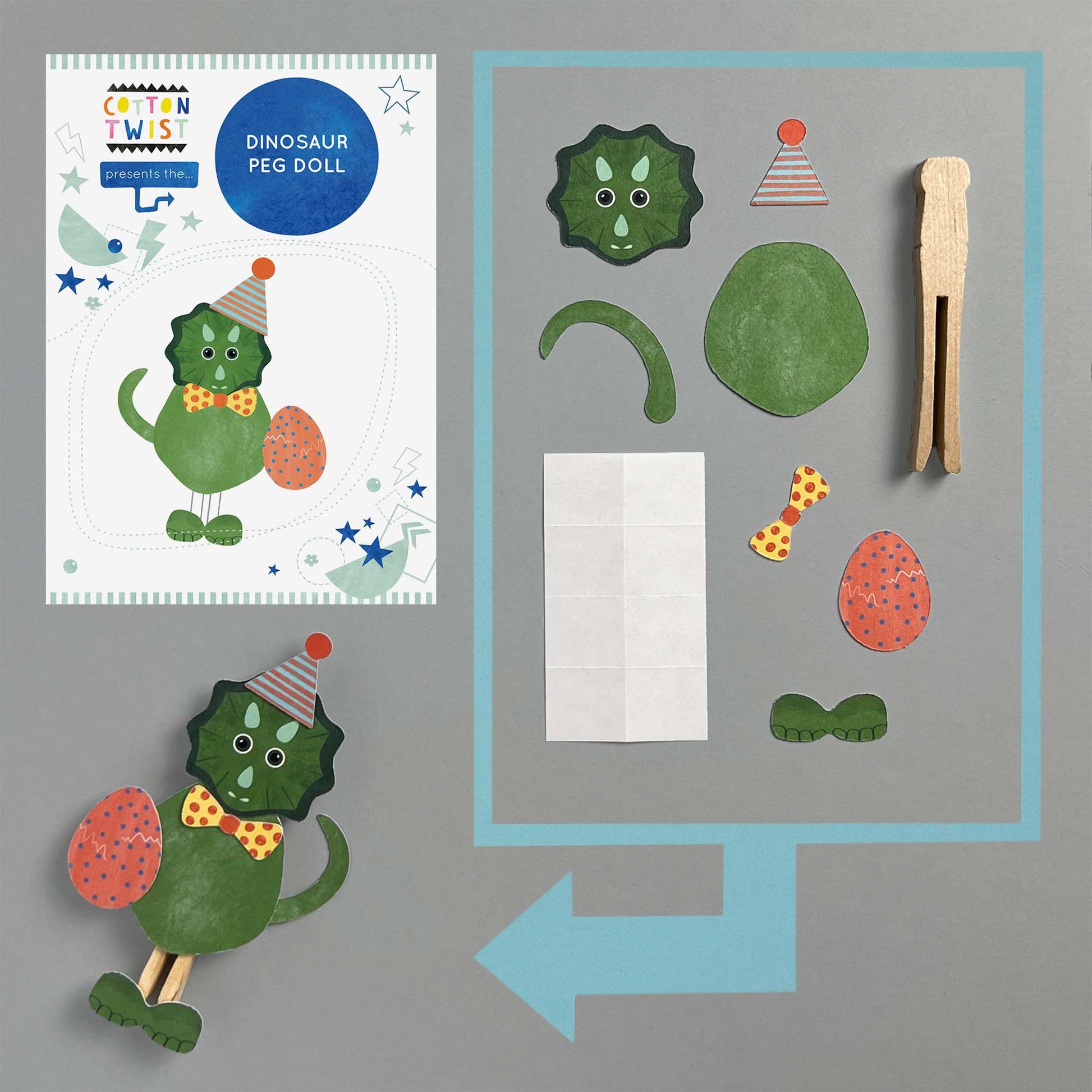 Children love to create, & this dinosaur peg doll is fun to make & sparks imaginative play. Gently push the pre cut shapes out from the sheets, then choose the accessories you love the most. The dinosaur comes with a body, head, tail, feet, bow tie and egg. Stick the chosen items onto the peg with the glue dots provided to create your doll & immerse yourselves in dino fun.