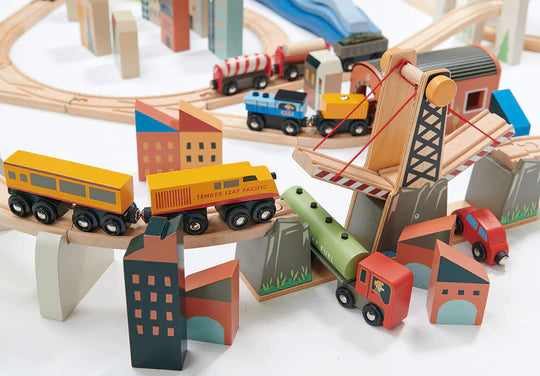 A truly magnificent modern take on the traditional train set. 58 pieces of track to create your very own layout every time, explore Industrial, Town and Holiday landscapes. Industrial area - 1 lifting road bridge, 3 chimney stacks with felt smoke, train shed, 7 factory buildings, container ship with 5 magnetic blocks, crane with lifting mechanism, train with 2 carriages to hold 2 more containers. Town - 10 contemporary city buildings, car ferry with yellow car, fuel lorry, container lorry, crane vehicle, long engine with 3 carriages for coal, logs and cement. Holiday - 5 elevating mountain passes, mountain bridge, waterfall area, cattle grid, wind turbines, small sailboat, red car and caravan, 3 tents, 3 fir trees, tender leaf pacific passenger train with 2 carriages, and a shy looking grizzly bear!