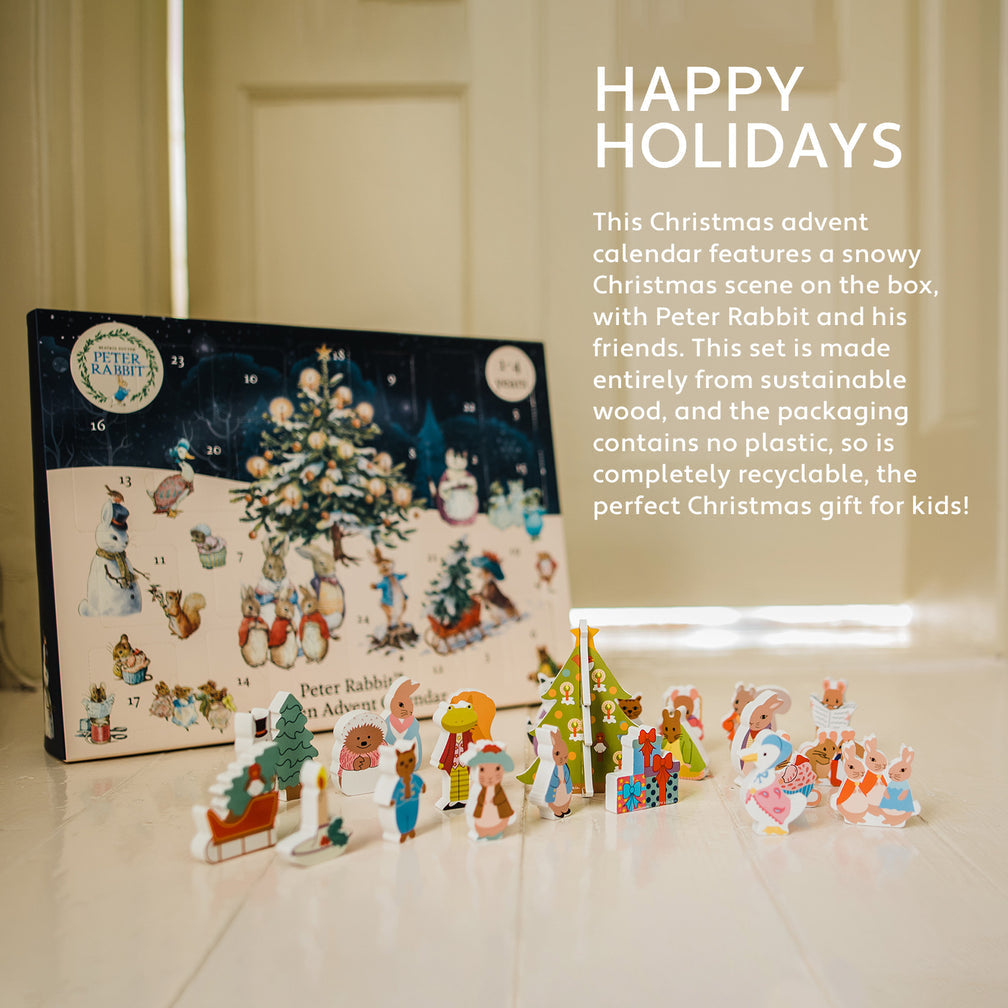 A beautiful wooden advent calendar with 24 wooden pieces featuring all the favourite Beatrix Potter characters, and their Christmas essentials!