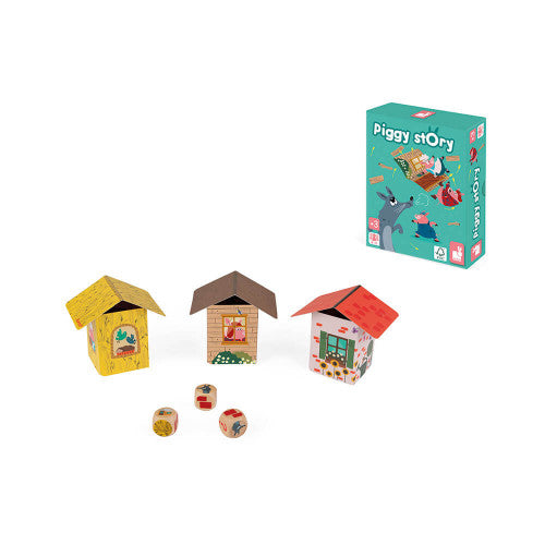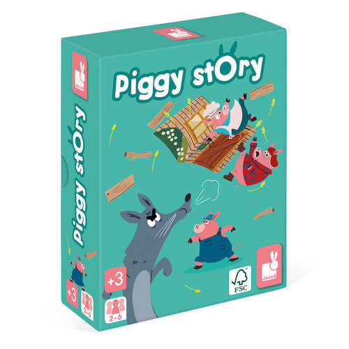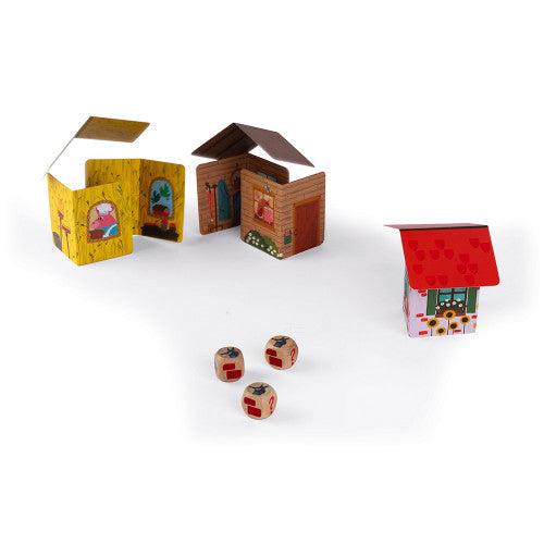 Help the 3 little pigs to build their house using 3 dice. But watch out for the wolf! If you roll at least 2 dice with a wolf head, you then become the big, bad wolf that blows on the houses of the other little pigs! 54 cards (7 x 10,5 cm) and 3 wooden dice. From 2 to 6 players. Rules of the game in French, English, German, German, Spanish and Italian. This product is made of FSC® -certified and other controlled material.