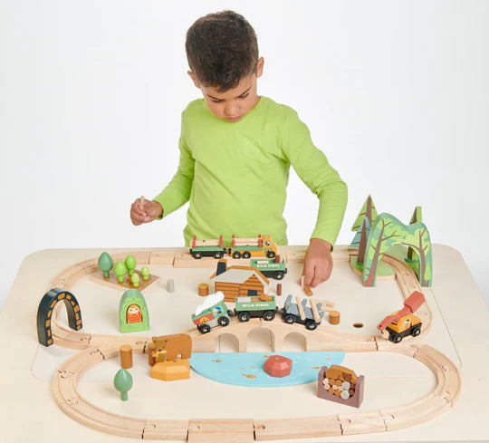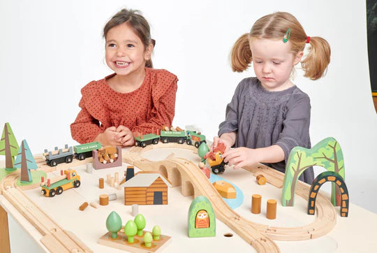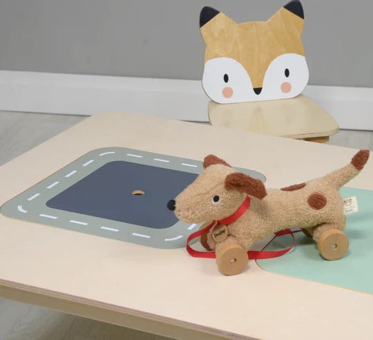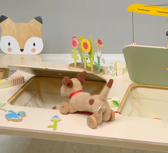A large white play table with 2 strong canvas storage areas. Turn the lids over to have a road printed on one side and on the other a soft green with a sweet little bird illustration. Great for any table top play, we love this for our train sets because the storage spade is so handy! Made from top quality plywood and rubberwood, this table is part of our popular forest furniture range. Designed to inspire children's imaginations and to grace any child's room décor.