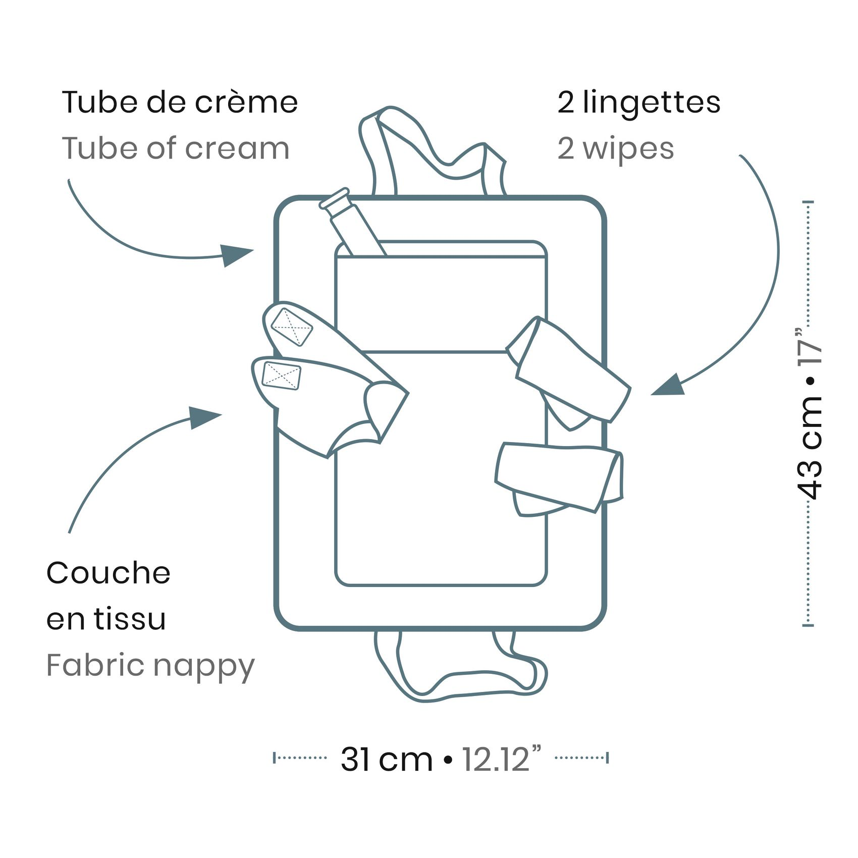 A portable changing bag to wash your baby. Once opened, it transforms into a comfortable mattress to lay the baby on. With the diaper, wipes and tube of cream, baby's bottom will be clean. An essential accessory to take everywhere!