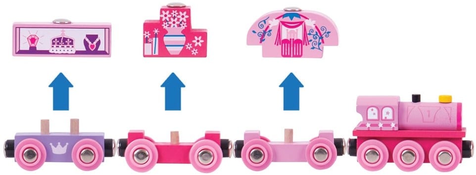 Simply push the Princess Train along to get moving! Pair with your favourite pink train set. Consists of 9 play pieces. Most other major wooden railway brands are compatible with Bigjigs Rail. Made from high quality, responsibly sourced materials. Conforms to current European safety standards.