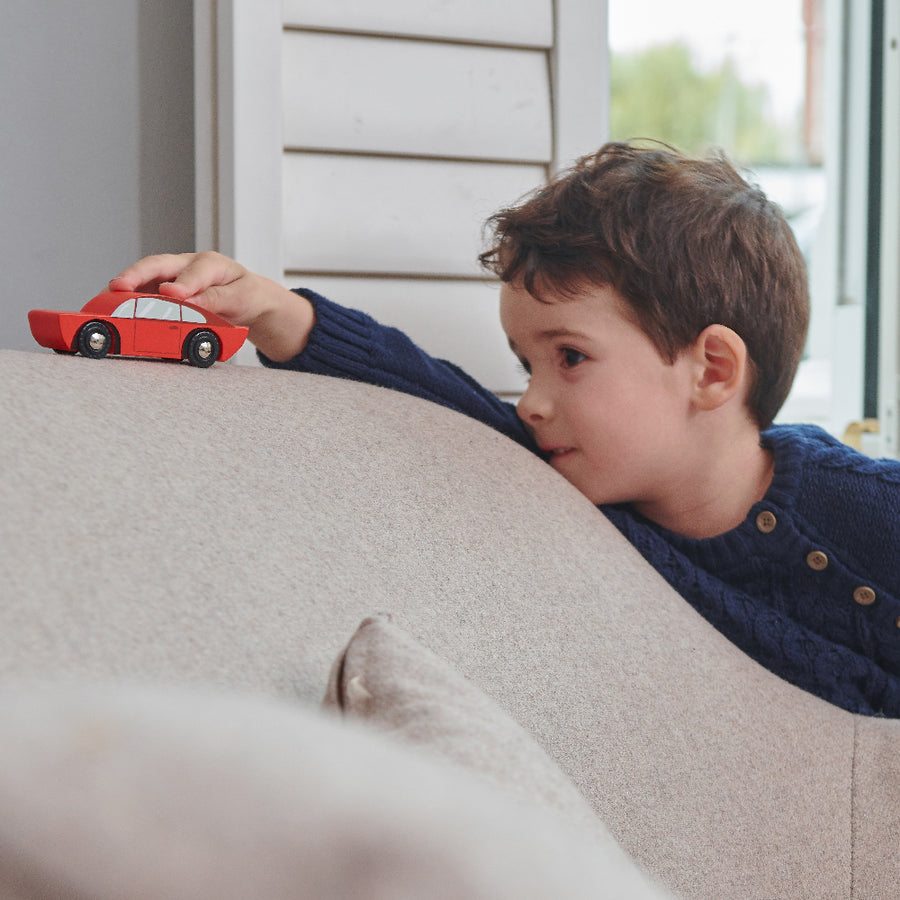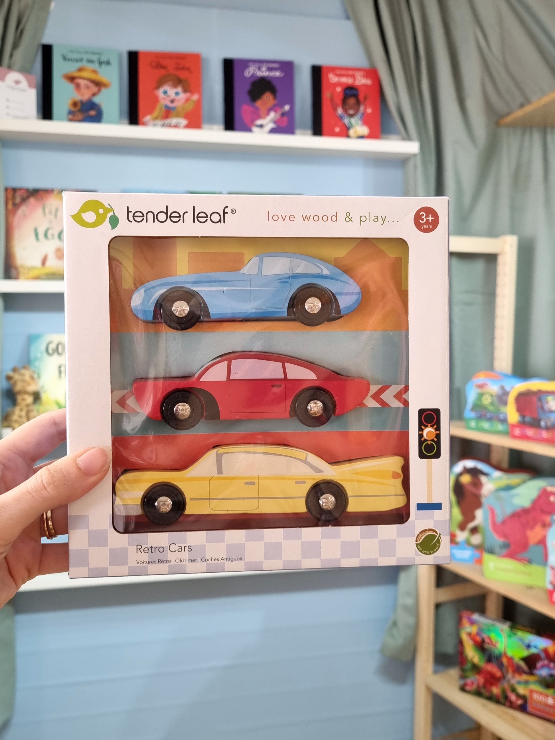 3 retro styled wooden toy cars in contemporary colours, styled on a Cadillac, Porsche and Ford. Standard wheel width fits on all train tracks.