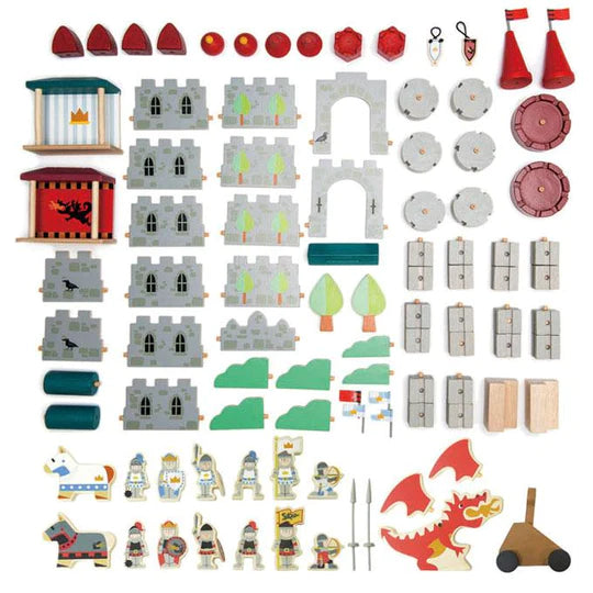 A magnificent collection of wooden modular castle components. Illustrated in a charming style, there are 2 kingdoms to battle it out in true medieval style...and team up with the beautiful Red Dragon of course! Set includes, 13 walls, 2 archways,2 heraldic shields, 20 connecting blocks,6 tower blocks,10 red tops, 4 castellations, 2 green towers, 6 red & black soldiers, 6 blue & white soldiers, 2 jousting tents, 6 flags, 2 horses, Dragon & trebuchet. 2 Trees, 2 stands, 6 hedges, 1 roof and 2 plastic spears.