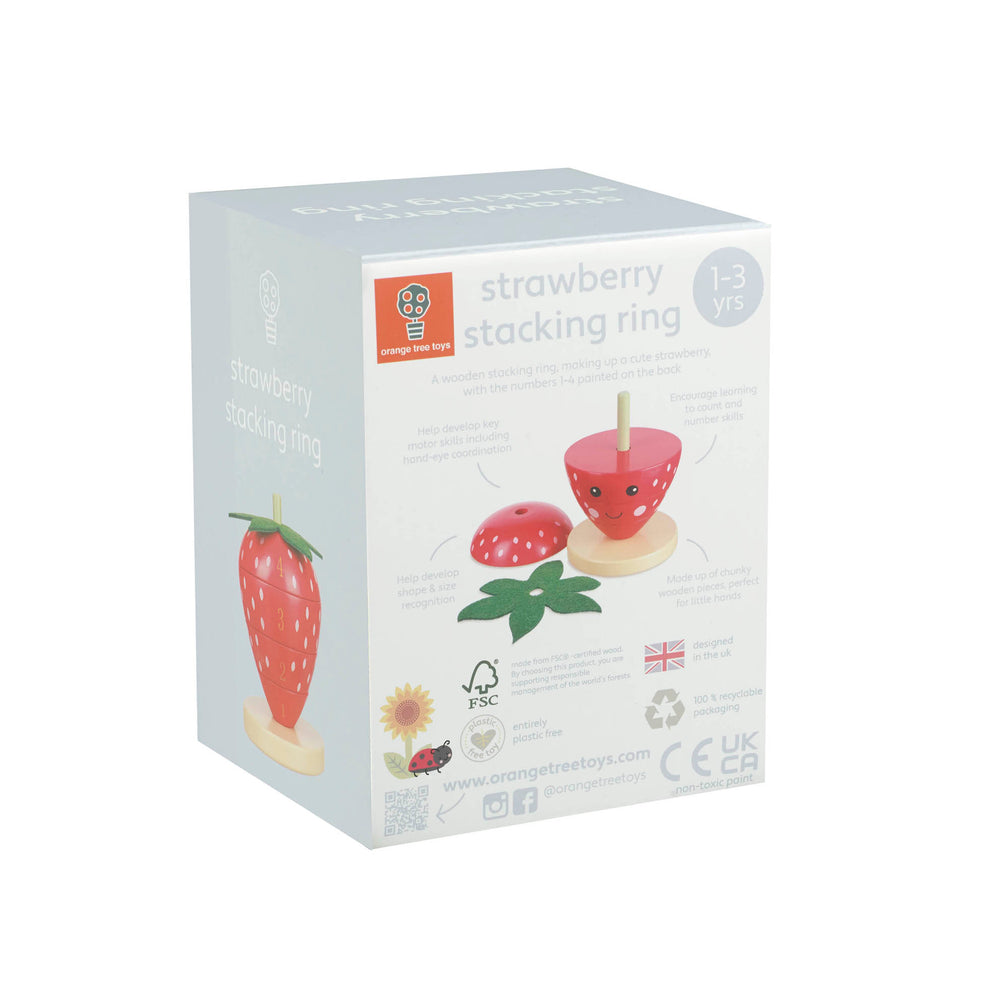 A wooden stacking ring, making up a cute strawberry. The numbers 1-4 are painted on the back of the pieces, helping to develop counting skills, as well as developing key motor skills, including hand eye coordination, shape and size recognition.