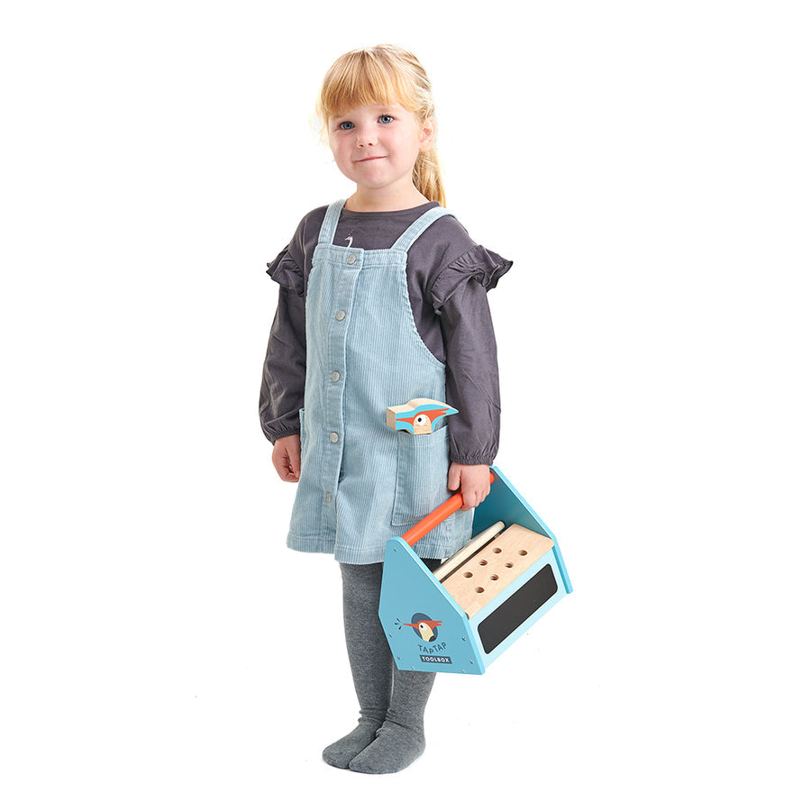 This is a wonderful addition to our ever-popular tool benches collection, a woodpecker themed tool box filled with everything you need to build something on your own. With two removable lid pieces that turn into screwable plates, and a cloth printed bag to pack away after play, this set makes a great gift idea for any child who is a budding creative.