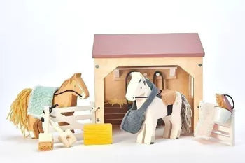 A wooden horse and stables dolls house accessory set for children. This working stable is perfect for grooming ponies! Feed the ponies with a bale of hay, scrub them down after a long day in the fields, and cover them with a blanket to keep them warm at night.