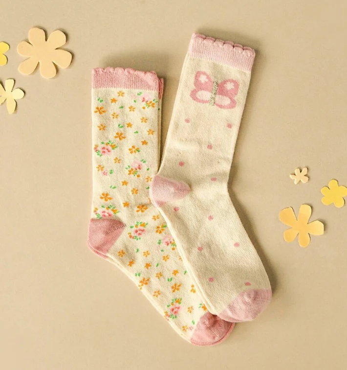 Bring a flutter of joy to little feet with out sweet pack of socks. One pair features a beautiful butterfly and is adorned with little spots, and a second pair in our gorgeous tiny blossom print. Made with organic cotton, they're perfect for everyday activities.