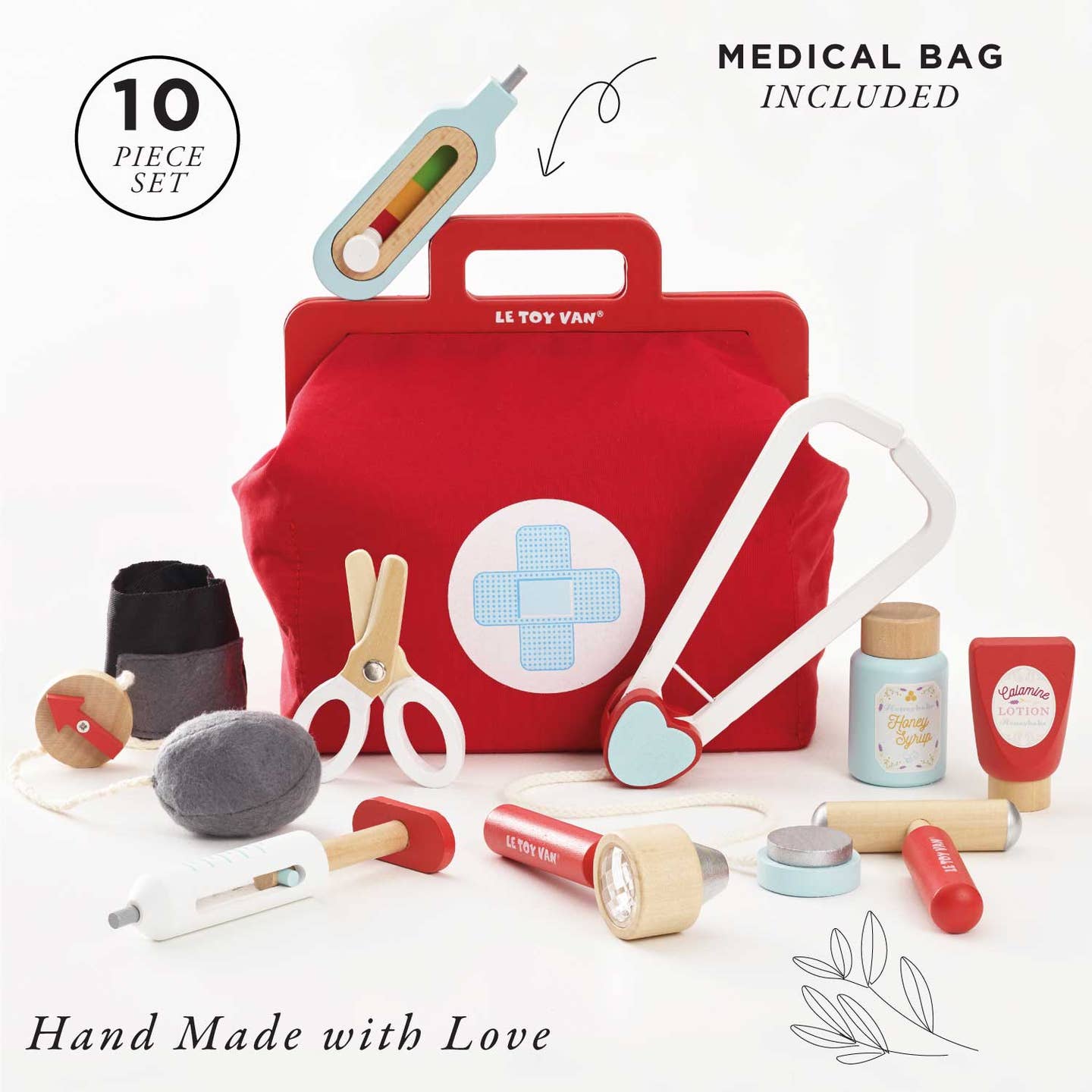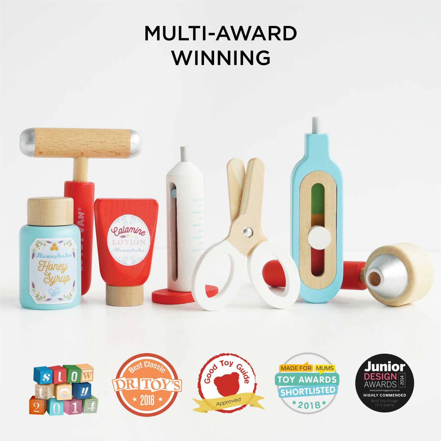 Complete with 9 colourful wooden play accessories and unique features to discover, including a stethoscope, thermometer, needle, surgical scissors, ointment and more.