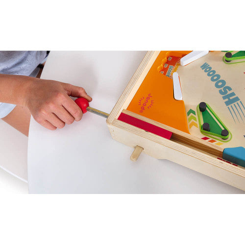 This beautiful pinball set is made of natural wood and decorated in warm colours. It’s enough to make anyone nostalgic for days gone by! As soon as you see it, all you’ll want to do is launch the ball into play - and then do everything you can to stop it falling back to the bottom of the tray. This wooden toy for children aged 5 and over will develop their concentration and keep them alert! They can use the wheels and elastic bands to earn bonus points! Launch the metal ball, ring the bell, and it’s seconds out for hours of solo or multiplayer fun for anyone who loves a challenge! The 3 metal balls will help you break all your records! FSC®-certified pinball set using wood from sustainably managed forests).
