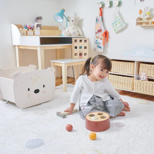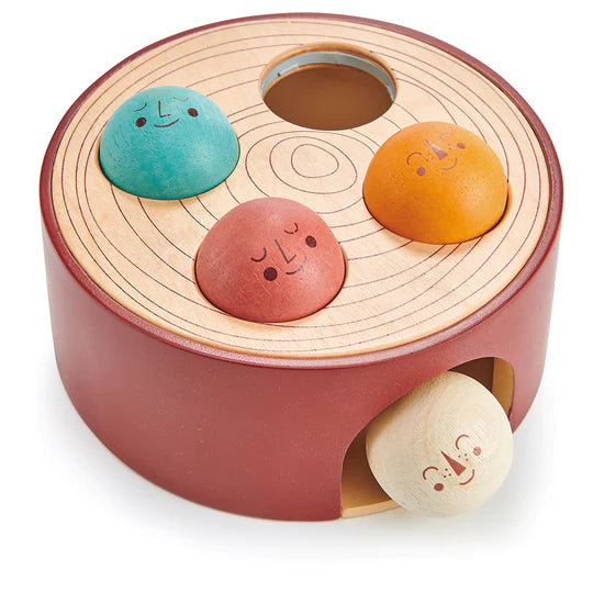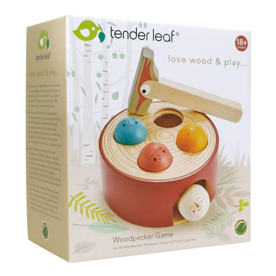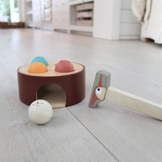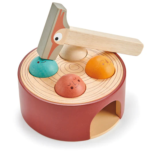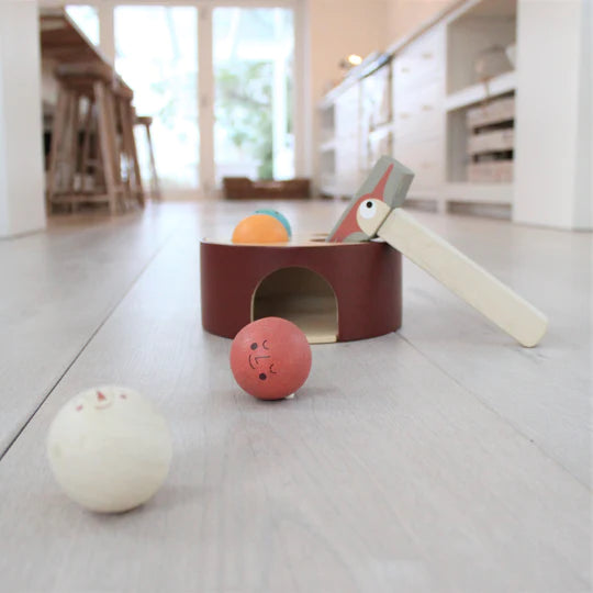A hammer game for active toddlers who love to bash things! Based on a tree trunk, bash the four balls with a woodpecker styled hammer. Collect the balls as they fall through the hole and repeat. With 4 colourful happy face balls this game is sure to delight any little one who loves to bash things! Made from sustainable rubber wood and responsibly sourced plywood, coloured with soft non-toxic colours for a contemporary style.
